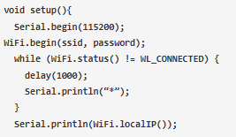 6. 在void setup函數中,將模塊與Wi-Fi連接,并檢查來自服務器的傳入消息。初始化波特率為115200的串行通信,檢查給定的Wi-Fi網絡并打印IP地址。