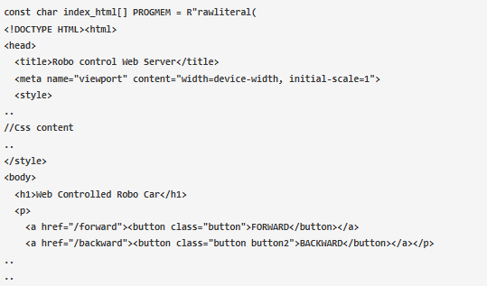 3. 現在,我們將制作一個HTML頁面,其中將有5個按鈕來移動機器人向前,向后,向右,向左和停止。該網頁還顯示了任何障礙物與機器人的距離。此HTML代碼將使用programm關鍵字存儲在Program內存中。