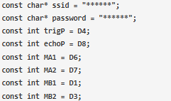2. 設置Wi-Fi證書,并聲明傳感器和電機驅動器所需的所有NodeMCU引腳。