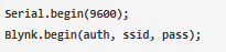 4. 接下來,在void setup()函數(shù)中,我們通過提供具有Auth令牌的Wi-Fi用戶名和密碼來初始化設(shè)備,并開始串行通信。