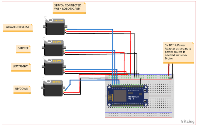 如上所示,我們總共需要4個(gè)伺服電機(jī)來操作我們的機(jī)械臂,因?yàn)檫@些電機(jī)不消耗太多的功率,它們是由1A適配器的5V直流電源直接驅(qū)動(dòng)的。我已經(jīng)使用面包板使上述連接;一旦連接完成,我的設(shè)置看起來像這樣。