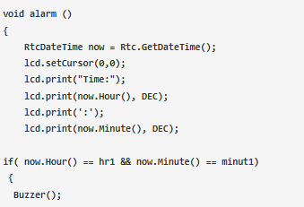在void alarm()循環(huán)中,我們將從RTC模塊獲取時(shí)間數(shù)據(jù)并將其打印在LCD上。然后,將當(dāng)前時(shí)間與警報(bào)時(shí)間進(jìn)行比較,如果當(dāng)前時(shí)間與警報(bào)時(shí)間匹配,則啟動(dòng)蜂鳴器。