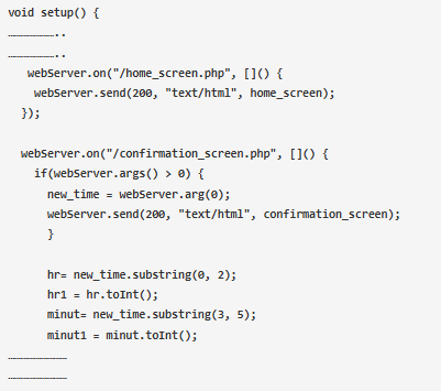 在void setup()中,我們將以05:45的格式從用戶獲取報(bào)警數(shù)據(jù),其中05為小時(shí),45為分鐘。此數(shù)據(jù)將保存在名為‘ new_time ’的字符串中。獲得數(shù)據(jù)后,我們必須將其分成小時(shí)和分鐘的形式,以便與當(dāng)前時(shí)間進(jìn)行比較。為了分割數(shù)據(jù),我們使用了‘ mystring ’。substring(from, to) ‘函數(shù),其中’ mystring '是一個(gè)String類型的變量,包含要分割的字符串。將字符串拆分為分鐘和小時(shí)字符串之后,現(xiàn)在是時(shí)候?qū)⒆址D(zhuǎn)換為整數(shù)了。對(duì)于“mystring. toint()”函數(shù),其中‘ mystring ’是您想要轉(zhuǎn)換為整數(shù)的字符串。