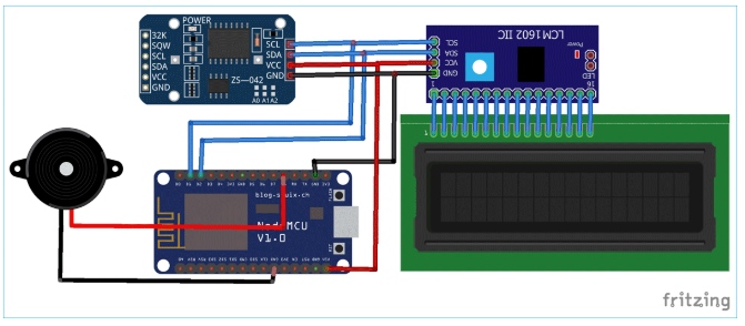 DS3231 RTC模塊和LCD I2C模塊的Vcc和GND引腳與NodeMCU的Vin和GND引腳相連。而DS3231和I2C模塊的SCL和SDA引腳分別與NodeMCU的D1和D2引腳相連。蜂鳴器連接在NodeMCU的D8引腳上,用于告警。
