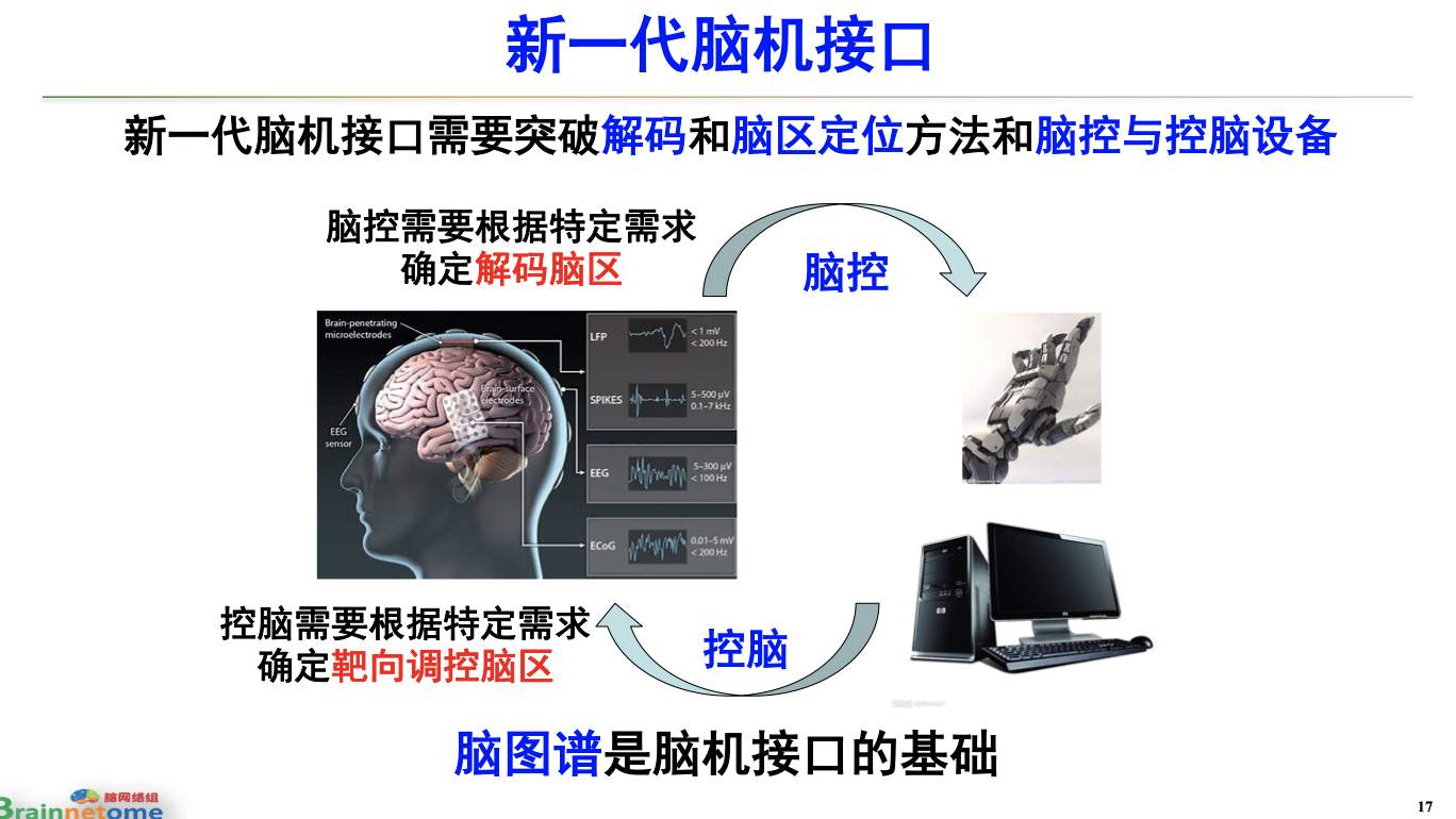 “腦機(jī)接口是很重要的板塊,主要根據(jù)自己的理解,我認(rèn)為是解碼人腦,所以分為腦控與控腦,無論是腦控還是控腦,腦圖譜是根本的,腦控是運(yùn)動(dòng)控制還是視覺替代,要找準(zhǔn)在什么地方解碼,腦機(jī)接口還是比較簡單的?!笔Y教授提出,腦控與控腦是腦機(jī)接口的重要組成部分。通過腦網(wǎng)絡(luò)圖譜的研究,可以繪制大腦活動(dòng)的完整連接圖。這不僅為運(yùn)動(dòng)控制和視覺替代提供了理論依據(jù),也為情緒相關(guān)研究奠定了基礎(chǔ)。他還特別提到,腦網(wǎng)絡(luò)圖譜為什么這么重要?習(xí)近平總書記在2016年科技三會(huì)講話中,談到破解創(chuàng)新發(fā)展科技難題時(shí)指出:腦連接圖譜研究是認(rèn)知腦功能并進(jìn)而探討意識(shí)本質(zhì)的科學(xué)前沿,這方面探索不僅有重要科學(xué)意義,而且對(duì)腦疾病防治、智能技術(shù)發(fā)展也具有引導(dǎo)作用。把腦網(wǎng)絡(luò)圖譜放在非常重要的位置。