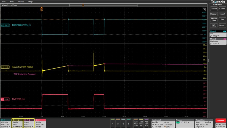 圖3. 在半橋功率轉(zhuǎn)換器上進(jìn)行的雙脈沖試驗(yàn)。上方(藍(lán)色)波形表示VDS。黃色波形清楚地顯示了IsoVu隔離電流探頭測(cè)量的快速上升漏極電流和震蕩。紫色波形表示負(fù)載電感電流。最下方的(紅色)波形表示IsoVu隔離電壓探頭測(cè)得的柵極電壓。