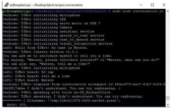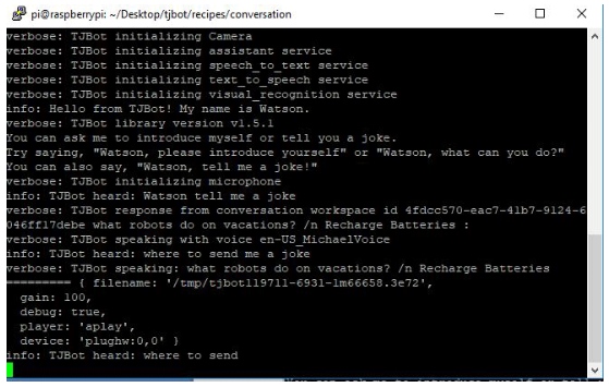 現(xiàn)在,我們準(zhǔn)備運(yùn)行IBM沃森助手。因此,在tjbot/recipes/conversation文件夾中運(yùn)行下面的命令來啟動(dòng)助手。