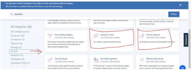 2. 單擊搜索欄右側(cè)給出的Catalog。現(xiàn)在,點(diǎn)擊AI選項(xiàng)。為了與Bot聊天,我們需要在這個(gè)平臺(tái)上提供三個(gè)服務(wù)。這些服務(wù)包括語(yǔ)音到文本、文本到語(yǔ)音和沃森助手。因此,添加這些服務(wù),并注意在添加這些API密鑰時(shí)我們將獲得的API密鑰。注意每個(gè)服務(wù)的鍵。