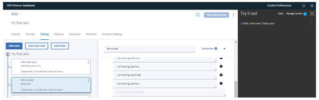 我們已經(jīng)完成了為IBM聊天機(jī)器人設(shè)置服務(wù)的工作。現(xiàn)在,我們需要?jiǎng)?chuàng)造技能并用可能的答案訓(xùn)練它。