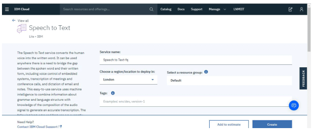 3. 我們將從向文本添加語(yǔ)音開始,添加其他服務(wù)的步驟將與下面描述的相同。點(diǎn)擊語(yǔ)音轉(zhuǎn)文本服務(wù)然后點(diǎn)擊創(chuàng)建。