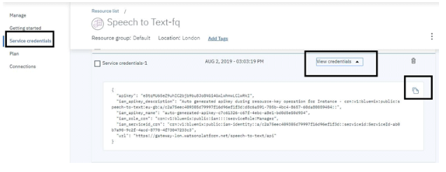4. 單擊Service Credentials,然后單擊View Credentials。通過點(diǎn)擊復(fù)制圖標(biāo)復(fù)制整個(gè)內(nèi)容,如下所示。