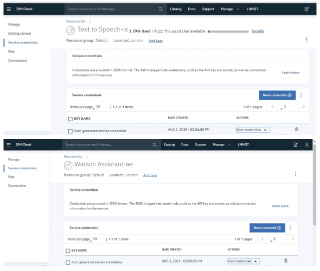5. 現(xiàn)在,將同一AI目錄中的文本添加到語(yǔ)音和沃森助手,并復(fù)制每個(gè)服務(wù)的憑據(jù)。如果“服務(wù)憑據(jù)”中沒有出現(xiàn)憑據(jù),那么只需單擊“新憑據(jù)”,它就會(huì)出現(xiàn)。