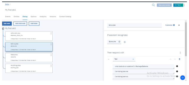 6. 在對(duì)話中,寫出對(duì)所問問題的回答。然后創(chuàng)建一個(gè)包含可能問題的節(jié)點(diǎn),并為它編寫可能的答案。默認(rèn)情況下,已經(jīng)有兩個(gè)節(jié)點(diǎn),一個(gè)是Welcome note,另一個(gè)是其他節(jié)點(diǎn)。