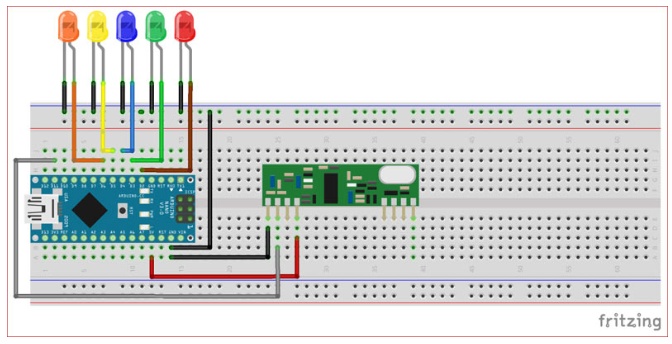 使用Arduino Nano的射頻接收器電路圖如下圖所示。這里我們有一系列的led。led根據(jù)接收器接收到的電位器值進(jìn)行移位。