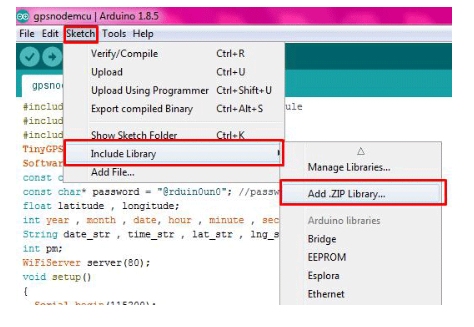 要在Arduino IDE中添加庫,請轉(zhuǎn)到Sketch>>Include library>> add . zip library,然后上傳從上述鏈接下載的庫。