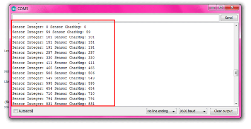 接收器的輸出顯示接收到的傳感器值。led根據(jù)傳感器值的范圍移位。在這里,我們?yōu)槊總€(gè)LED給出了200的范圍。