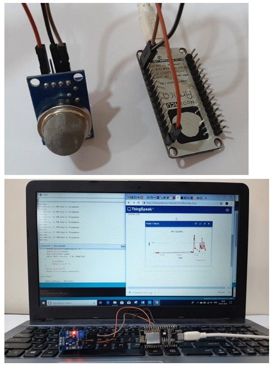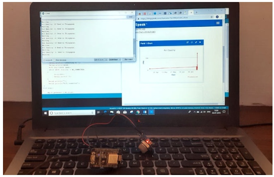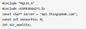 該代碼首先包含MQ135傳感器庫(kù)和ESP8266 wifi庫(kù)。MQ135傳感器庫(kù)用于從MQ135傳感器讀取數(shù)據(jù)。之后,輸入ThingSpeak API密鑰和服務(wù)器地址,并定義將在代碼中使用的變量。