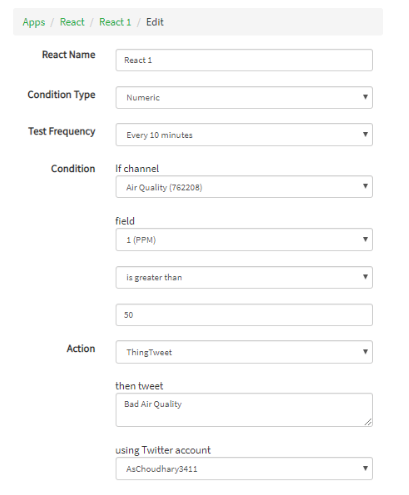 保存React并運(yùn)行代碼?,F(xiàn)在,每當(dāng)PPM值超過(guò)50時(shí),它就會(huì)向您的twitter帳戶發(fā)送通知。您可以通過(guò)修改“測(cè)試頻率”來(lái)更改通知頻率。