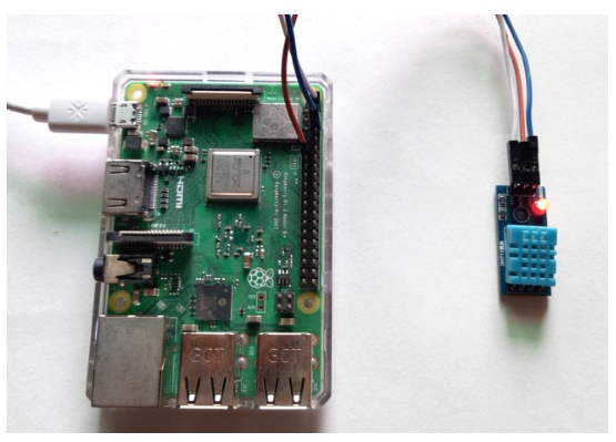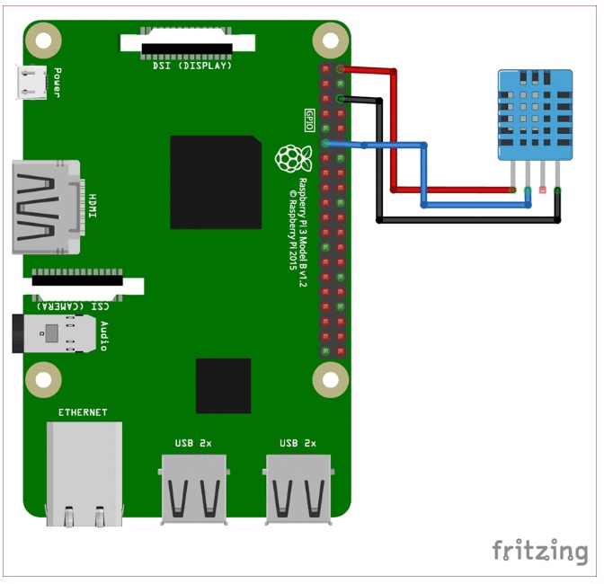 最后,如連接圖所示,將DHT傳感器與gpio17連接,并使用python filename.py命令運行腳本。