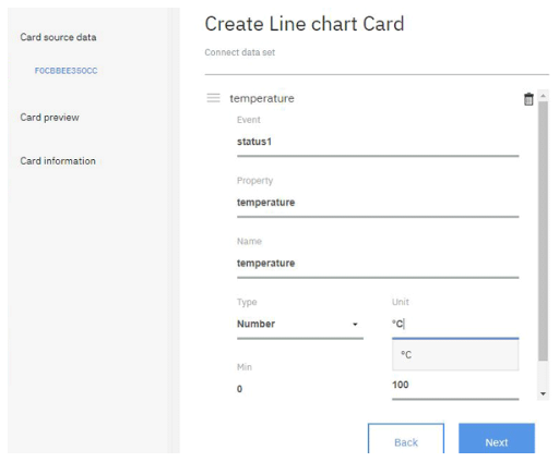 15. 現(xiàn)在,輸入要顯示在圖上的數(shù)據(jù)。我們將在status1事件上發(fā)送溫度值(代碼中提到了status1變量)。將屬性和名稱設置為溫度,類型設置為數(shù)字,單位設置為攝氏度,然后單擊Next。