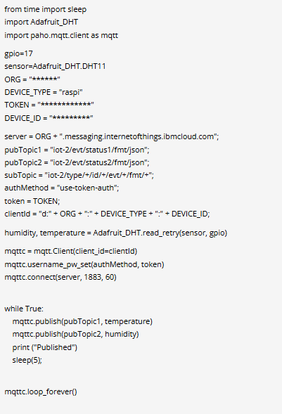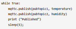 現(xiàn)在,在while循環(huán)中,我們將每隔5秒連續(xù)向IBM云發(fā)送溫度和濕度數(shù)據(jù)。
