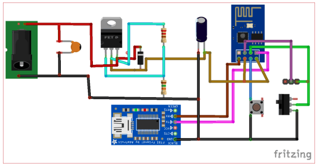 如圖所示,用Arduino和RFID-RC522替換FTDI板。RFID掃描儀由Arduino的3.3V引腳供電,ESP由LM317穩(wěn)壓器供電,通過12V直流適配器供電時(shí),穩(wěn)壓3.3V。Arduino UNO模塊通過USB接口供電。