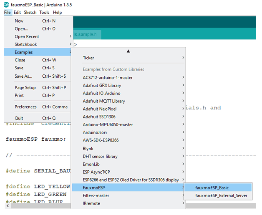 4. 在fauxmoESP中有一個(gè)用于控制設(shè)備的示例代碼,我們必須修改這個(gè)示例。打開Arduino IDE并進(jìn)入Examples -> FauxmoESp -> fauxmoESP_Basic。