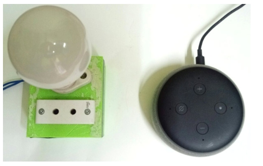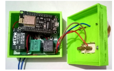 整個(gè)裝置組裝在一個(gè)3D打印的盒子里,給它一個(gè)智能電器板的外觀。有一個(gè)燈泡座和一個(gè)插座,可以為電視等電器充電。組裝好的盒子如下圖所示。