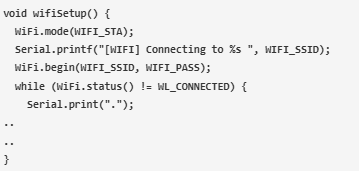 為Wi-Fi設(shè)置一個(gè)單獨(dú)的函數(shù),以便它可以在void setup函數(shù)中調(diào)用。將WiFi模式設(shè)置為站模式,并在WiFi.begin()函數(shù)中傳遞SSID和Password。等待連接建立,顯示ESP的IP地址。