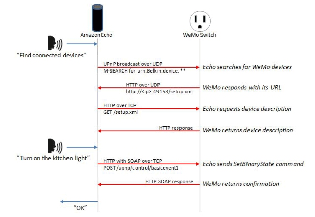 現(xiàn)在,Echo檢測到設(shè)備并建立連接。Echo和WeMo通過HTTP連接并發(fā)出“SetBinaryState”(On/OFF)命令。然后WeMo接受該命令并通過HTTP發(fā)送確認(rèn)。下面給出了使用Alexa模擬WeMo開關(guān)的完整流程圖