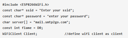 首先包括所需的庫,并為Wi-Fi SSID和密碼定義變量,以初始化Wi-Fi連接。由于我們需要連接到SMTP服務(wù)器,因此聲明了一個(gè)帶有服務(wù)器地址的變量。D0是NodeMCU上的引腳,用于火焰?zhèn)鞲衅鞯臄?shù)字輸入。