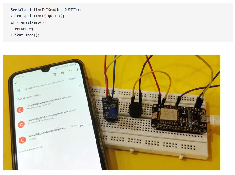 這里我們將火焰?zhèn)鞲衅鞯臄?shù)字輸入存儲(chǔ)在一個(gè)變量中。如果輸入為“0”(低),則表示火焰傳感器已檢測到火災(zāi),并使用sendEmail()函數(shù)發(fā)送電子郵件。