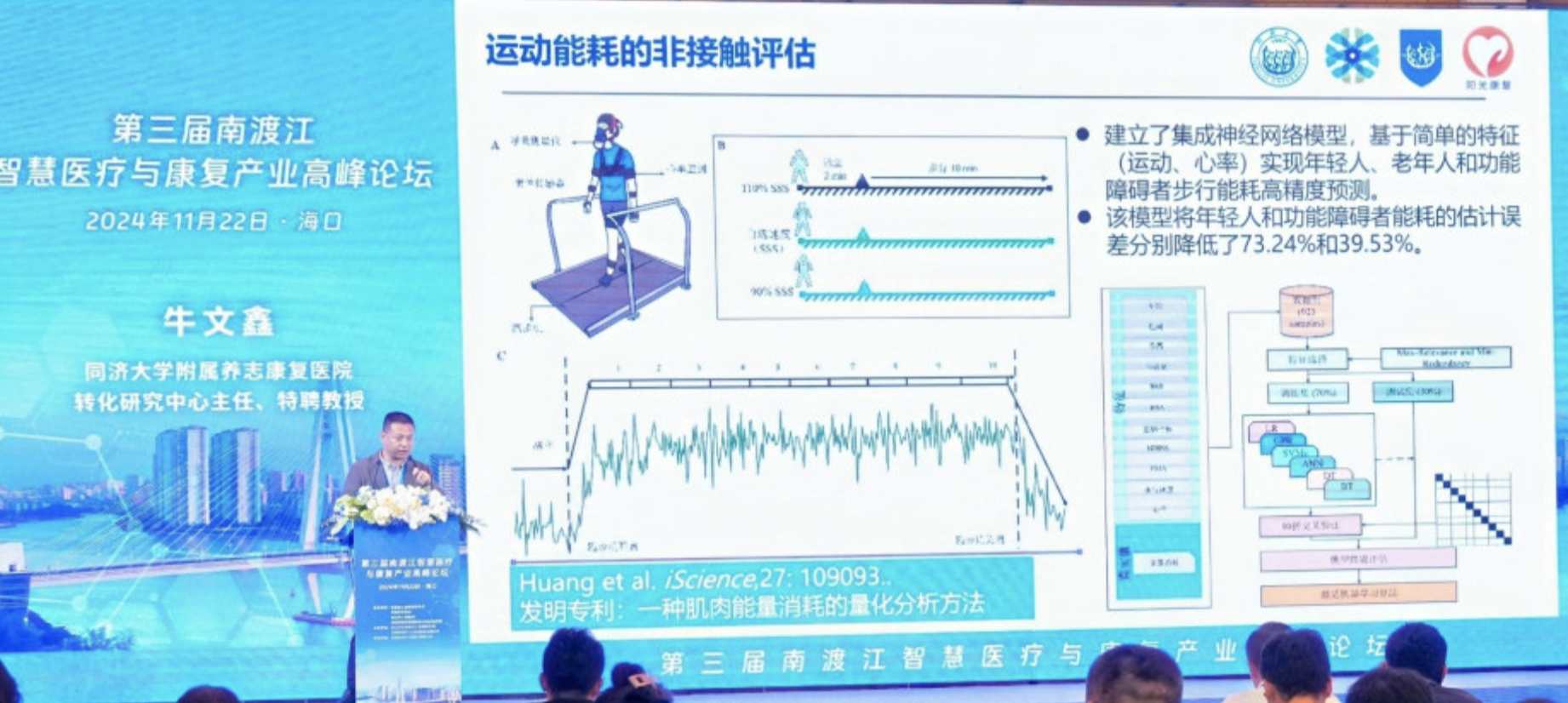 牛教授進(jìn)一步分享了康復(fù)過(guò)程中的能耗評(píng)估技術(shù)。他指出,運(yùn)動(dòng)能耗是評(píng)估患者康復(fù)效果的重要數(shù)據(jù),但傳統(tǒng)方法如呼吸面罩評(píng)估能耗非常麻煩且不易普及。為了解決這一問(wèn)題,牛教授團(tuán)隊(duì)開(kāi)發(fā)了基于人工智能的運(yùn)動(dòng)能耗預(yù)測(cè)模型,能夠通過(guò)簡(jiǎn)單的特征和參數(shù)預(yù)測(cè)患者在康復(fù)運(yùn)動(dòng)過(guò)程中的能量消耗。“這一模型比現(xiàn)有國(guó)際標(biāo)準(zhǔn)的誤差減少了近40%,極大地提升了康復(fù)過(guò)程的精準(zhǔn)性和安全性?!?