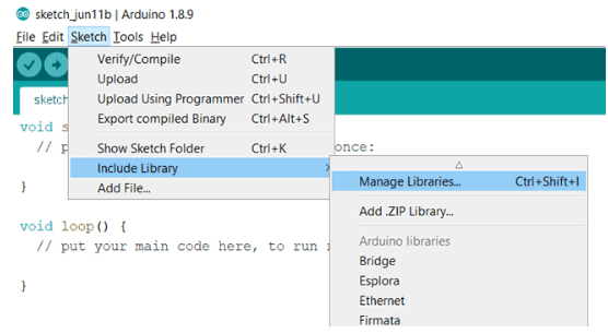 打開(kāi)Arduino IDE并轉(zhuǎn)到Sketch ->包括庫(kù)->管理庫(kù)。