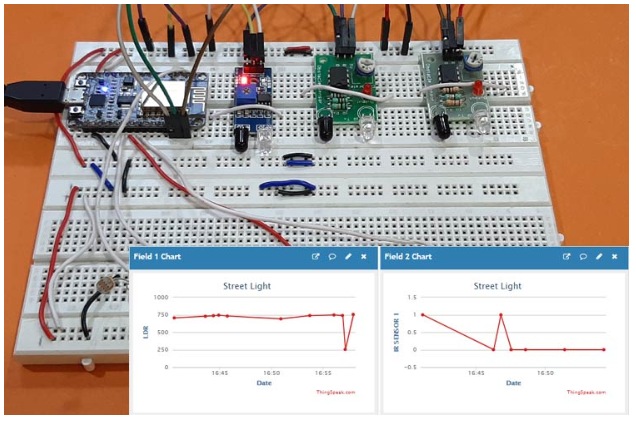 大多數(shù)地方都有自動(dòng)路燈,可以感知白天和黑夜,并根據(jù)晝夜自動(dòng)打開(kāi)和關(guān)閉。在這里,我們擴(kuò)展了這個(gè)項(xiàng)目,增加了一個(gè)額外的限制來(lái)打開(kāi)燈,路燈只會(huì)在黑暗中發(fā)光,有人穿過(guò)街道。該項(xiàng)目的主要目標(biāo)是通過(guò)只在需要時(shí)發(fā)光路燈來(lái)減少電力消耗。在這個(gè)項(xiàng)目中,我們展示了智能路燈的原型,它有3個(gè)紅外傳感器,1個(gè)LDR傳感器和3個(gè)led,每個(gè)led代表一個(gè)路燈。我們還將更新LDR傳感器數(shù)據(jù)到ThingSpeak,并從世界任何地方通過(guò)互聯(lián)網(wǎng)控制led(路燈)。