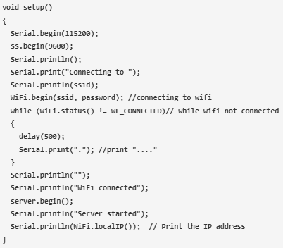 在setup()函數(shù)中,首先將波特率設(shè)置為115200。然后使用WiFi SSID和密碼初始化WiFi連接。一旦將NodeMCU連接到WiFi網(wǎng)絡(luò),就會(huì)生成一個(gè)本地IP地址,并顯示在串口監(jiān)視器上。此IP地址將用于訪問您的手機(jī)或筆記本電腦的GPS位置數(shù)據(jù)。