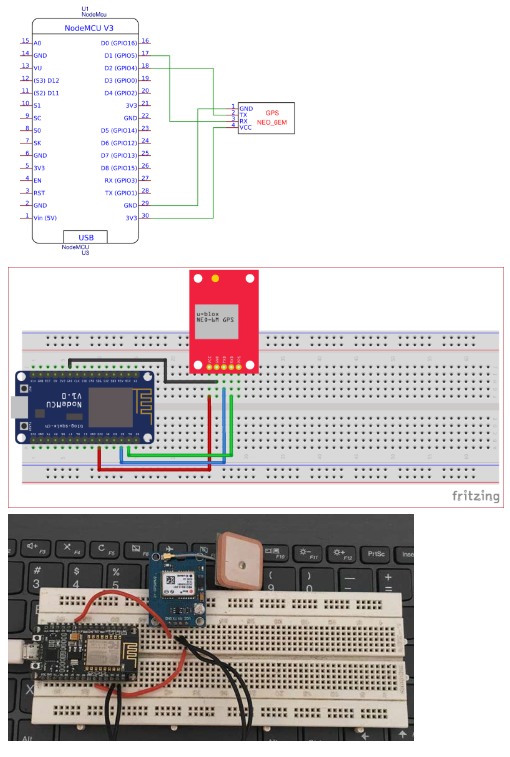 將Ublox Neo 6m GPS模塊直接連接到NodeMCU單板,將Neo 6m的GND引腳連接到NodeMCU的GND引腳,將VCC引腳連接到3v3引腳。也連接RXD到D1和TXD到D2。