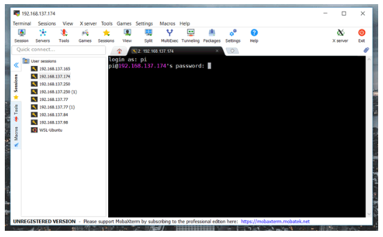 在輸入登錄id和密碼后,樹莓派將通過遠(yuǎn)程SSH服務(wù)器訪問MobXterm以使用命令提示符。