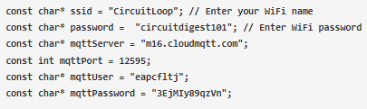 現(xiàn)在為我們的WiFi和MQTT連接聲明一些全局變量。在以下變量中輸入您的WiFi和MQTT詳細(xì)信息: