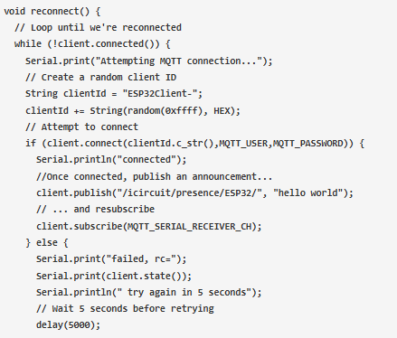 在下面的while循環(huán)函數(shù)中,它將連接到MQTT服務(wù)器并將其打印到串行監(jiān)視器上。這個(gè)進(jìn)程將在一個(gè)循環(huán)中運(yùn)行,直到它被連接。
