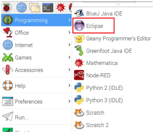 要加載Eclipse,請單擊Raspbian Icon > Programming > Eclipse。
