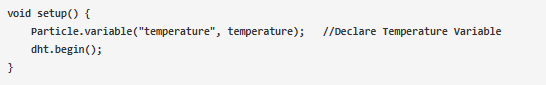 在void設(shè)置中聲明粒子。變量的函數(shù)。該函數(shù)將用于觸發(fā)消息,DHT .begin()啟動DHT傳感器。