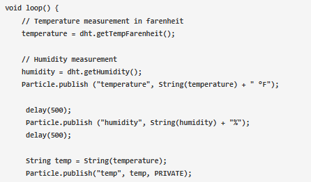在這個(gè)空環(huán)路功能中,DHT傳感器將測量溫度和濕度。,粒子。publish函數(shù)用于發(fā)布粒子云的數(shù)據(jù)。