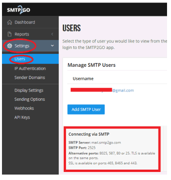 現(xiàn)在在左側(cè)的訪問欄上,點(diǎn)擊“設(shè)置”,然后點(diǎn)擊“用戶”。在這里,您可以看到有關(guān)SMTP服務(wù)器和端口號(hào)的信息。通常是這樣的:
