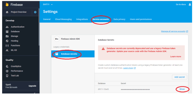8. 現(xiàn)在單擊“服務(wù)帳戶”,然后單擊“數(shù)據(jù)庫秘密”。