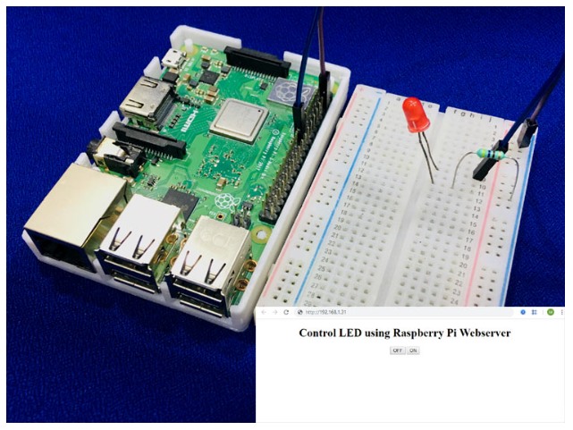 在這里,我們控制一個LED連接到樹莓派使用Apache web服務(wù)器。為此,我們創(chuàng)建了一個HTML/php網(wǎng)頁,其中有兩個按鈕-一個用于打開LED,另一個用于關(guān)閉LED。