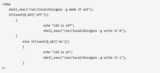這里我們在php代碼中使用了shell_exec()命令,該命令用于從php腳本中運行shell命令。在這里了解更多關(guān)于shell_exec的信息。如果直接從樹莓派的終端在shell_exec里面運行這個命令,可以直接將GPIO引腳27設(shè)置為低電平或高電平。下面是直接從終端測試LED的兩個命令。