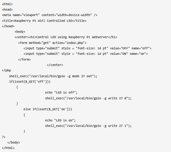 現(xiàn)在刪除index.php()文件中前面的代碼,并插入下面的PHP代碼來控制HTML代碼體中的GPIO引腳。