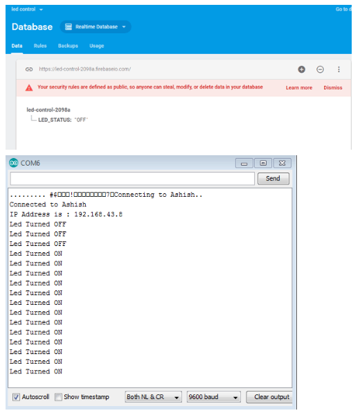 上傳代碼后,打開串行監(jiān)視器,在瀏覽器中打開firebase并轉(zhuǎn)到控制臺,然后選擇前面創(chuàng)建的項目。在這個進入數(shù)據(jù)庫,它會顯示最初的LED狀態(tài)是OFF,從這里你可以通過在這里寫ON來改變LED狀態(tài),你的LED會變成ON狀態(tài),你也可以在串行監(jiān)視器上看到你的LED狀態(tài)。