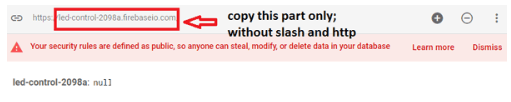 現(xiàn)在您的數(shù)據(jù)庫已經(jīng)創(chuàng)建,您將不得不再次來到這里來控制您的LED,現(xiàn)在只需在記事本中復(fù)制給定的URL,不帶斜杠和http。這是您的firebase主機,您將在稍后需要。